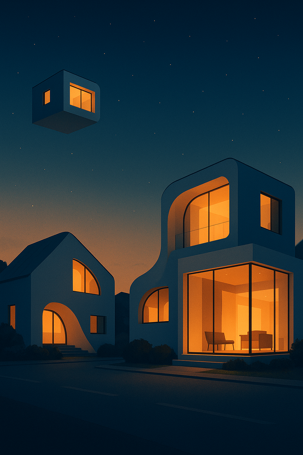 ガラス張りのモダンな家々は、温かなオレンジ色の光を灯し、