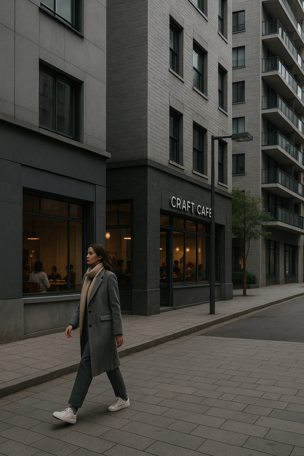カフェの壁は落ち着いたスモークグレー、マンションの外壁は無機質なライトグレー。