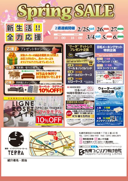 新着情報 2017-02-22 【TERRA】新生活全力応援 Spring SALE ■日時(2週連続開催) 2月25日(土)〜27日(月) 3月4日(土)〜6日(月) 営業時間:10:00〜18:00 ■場所 インテリアショールーム TERRA【テラ】 札幌市厚別区大谷地東1丁目2-40 TEL:011-894-1151 ■アクセス ・無料駐車場完備 ・地下鉄東西線「大谷地」駅から徒歩5分