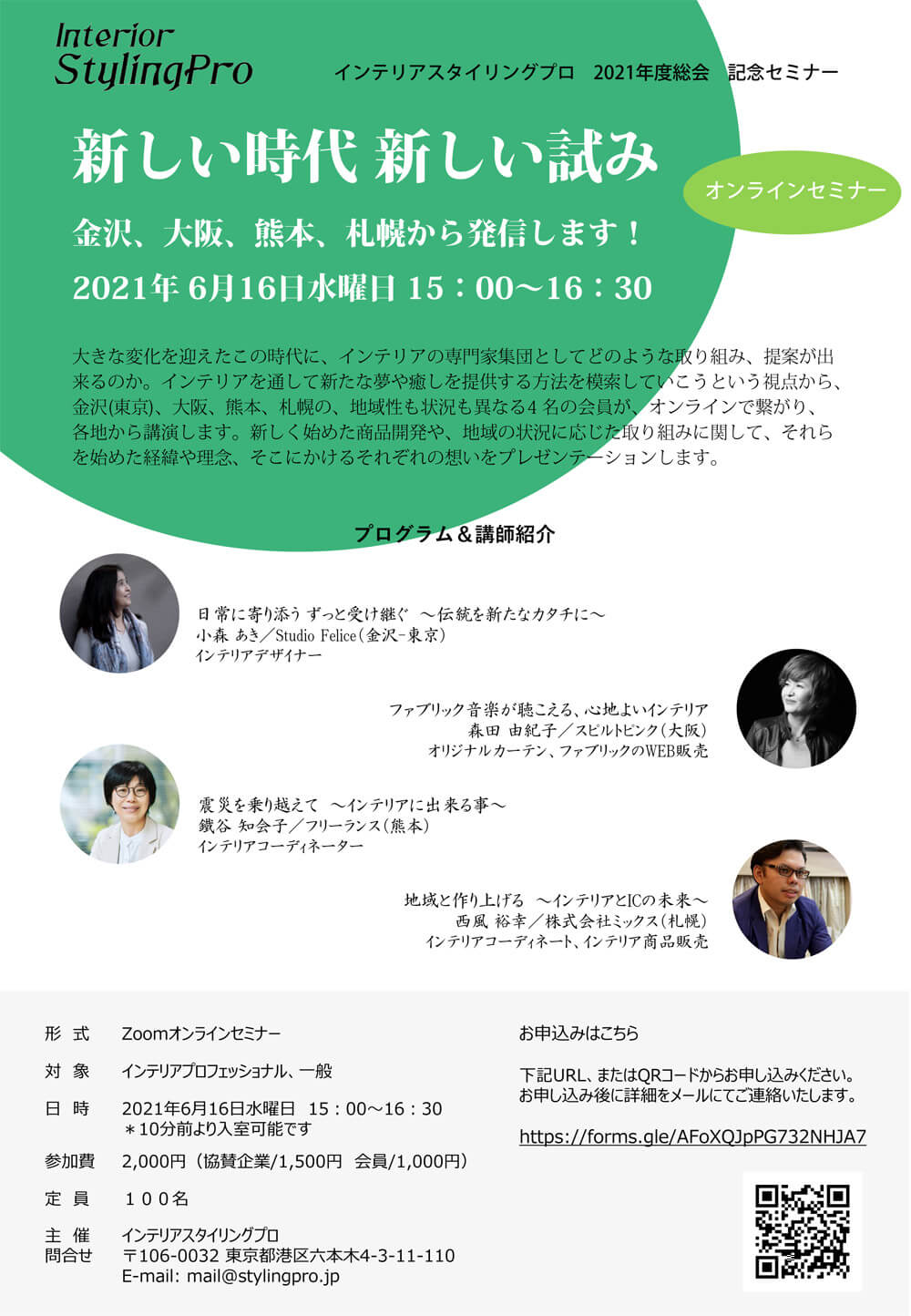 インテリアを通して新たな夢や癒しを提供する方法を模索していこうという視点から、金沢(東京)、大阪、熊本、札幌の地域性も状況も異なる4名の会員が、オンラインで繋がり、各地から講演します。